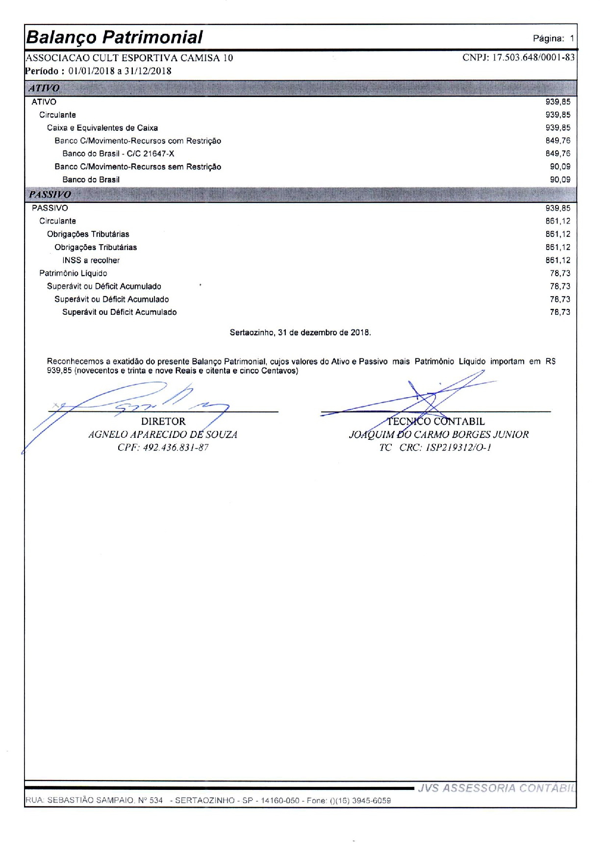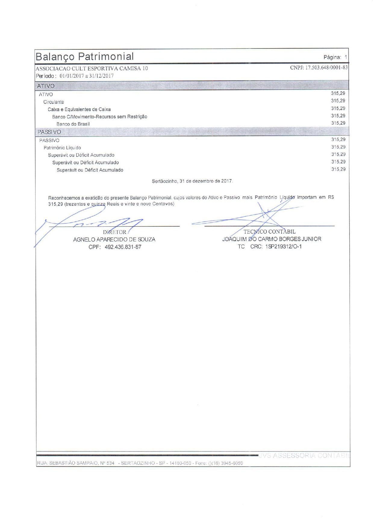 Valor Total da Parceria: R$ 8.995,00 com vigência no período 02/01/2024 até 31/12/2024 cujo o objeto é execução do projeto Camisa 10.